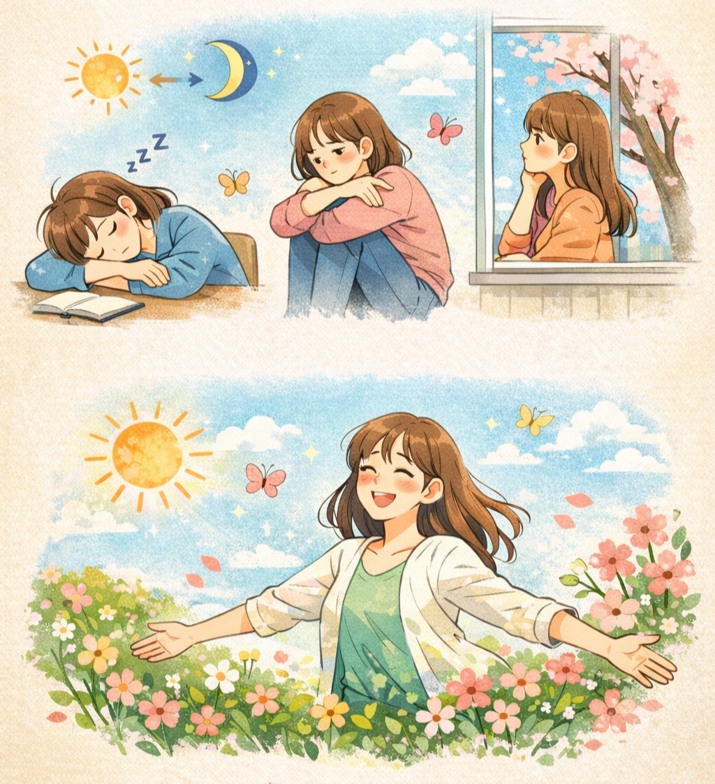 - 일조량 변화: 겨울보다 갑자기 길어지는 낮 시간은 멜라토닌 분비를 억제하고, 세로토닌 불균형을 유발해 감정 변화가 생깁니다.
